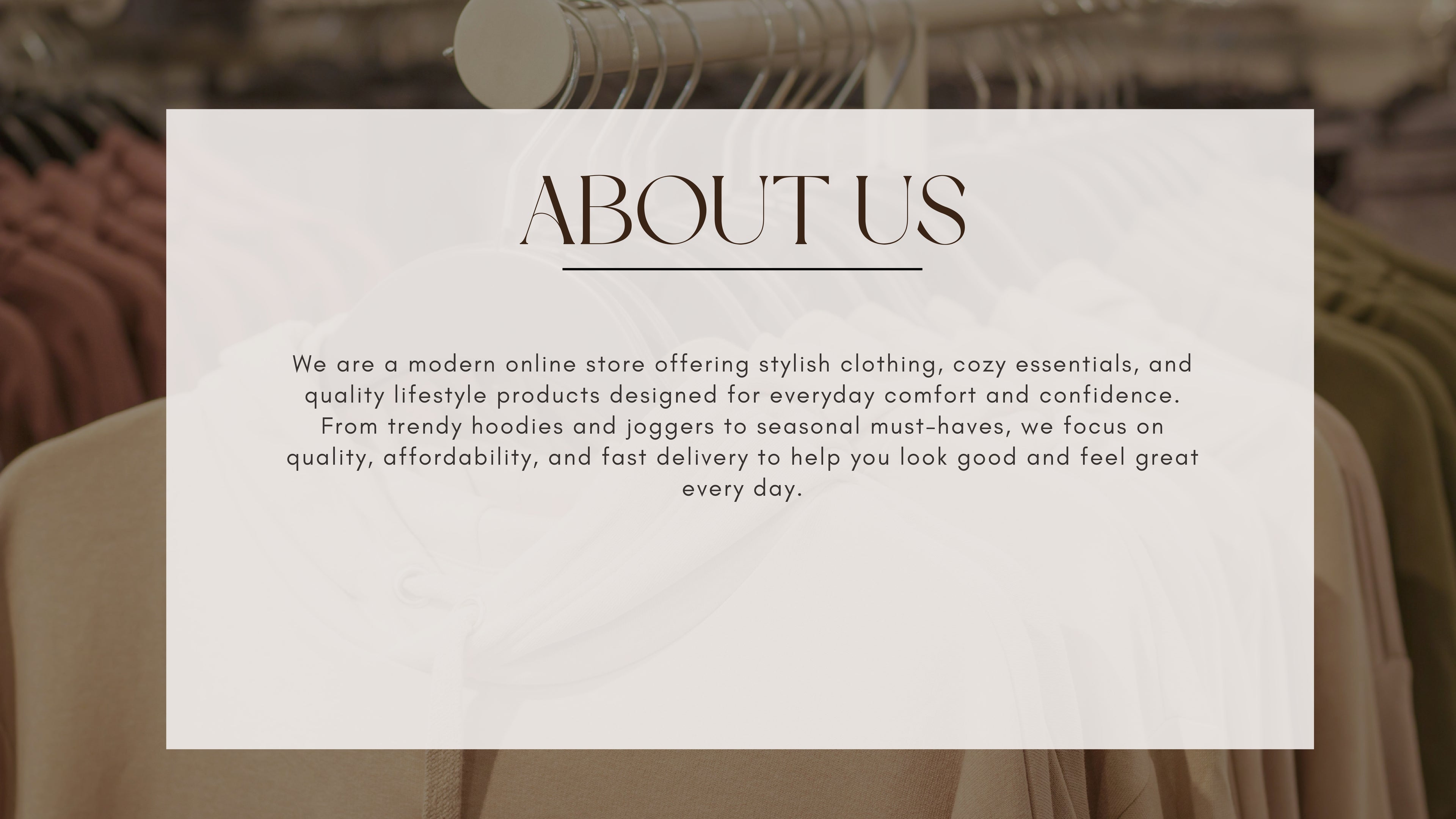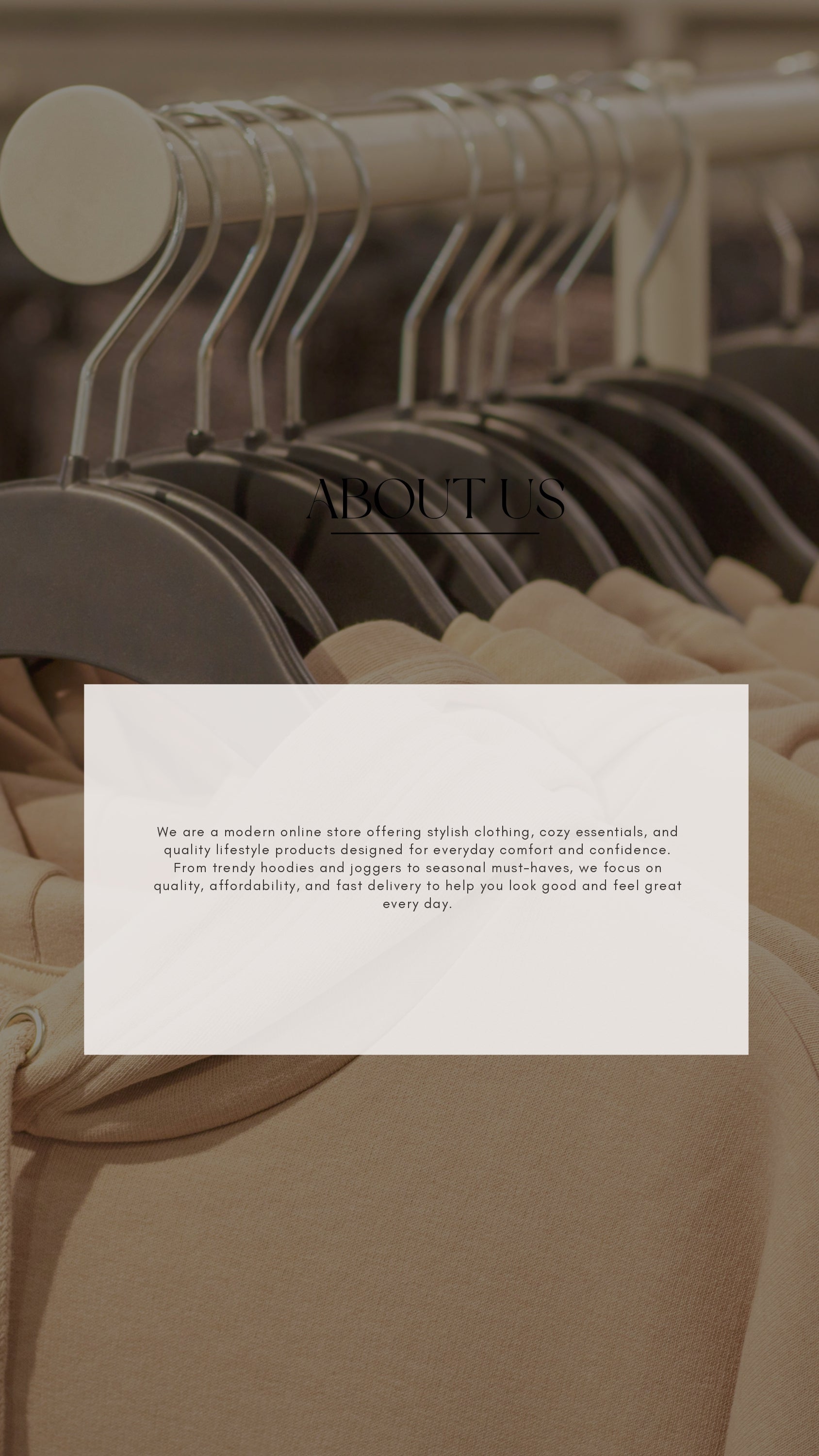 We are a modern online store offering stylish clothing, cozy essentials, and quality lifestyle products designed for everyday comfort and confidence. From trendy hoodies and joggers to seasonal must-haves, we focus on quality, affordability, and fast delivery to help you look good and feel great every day.